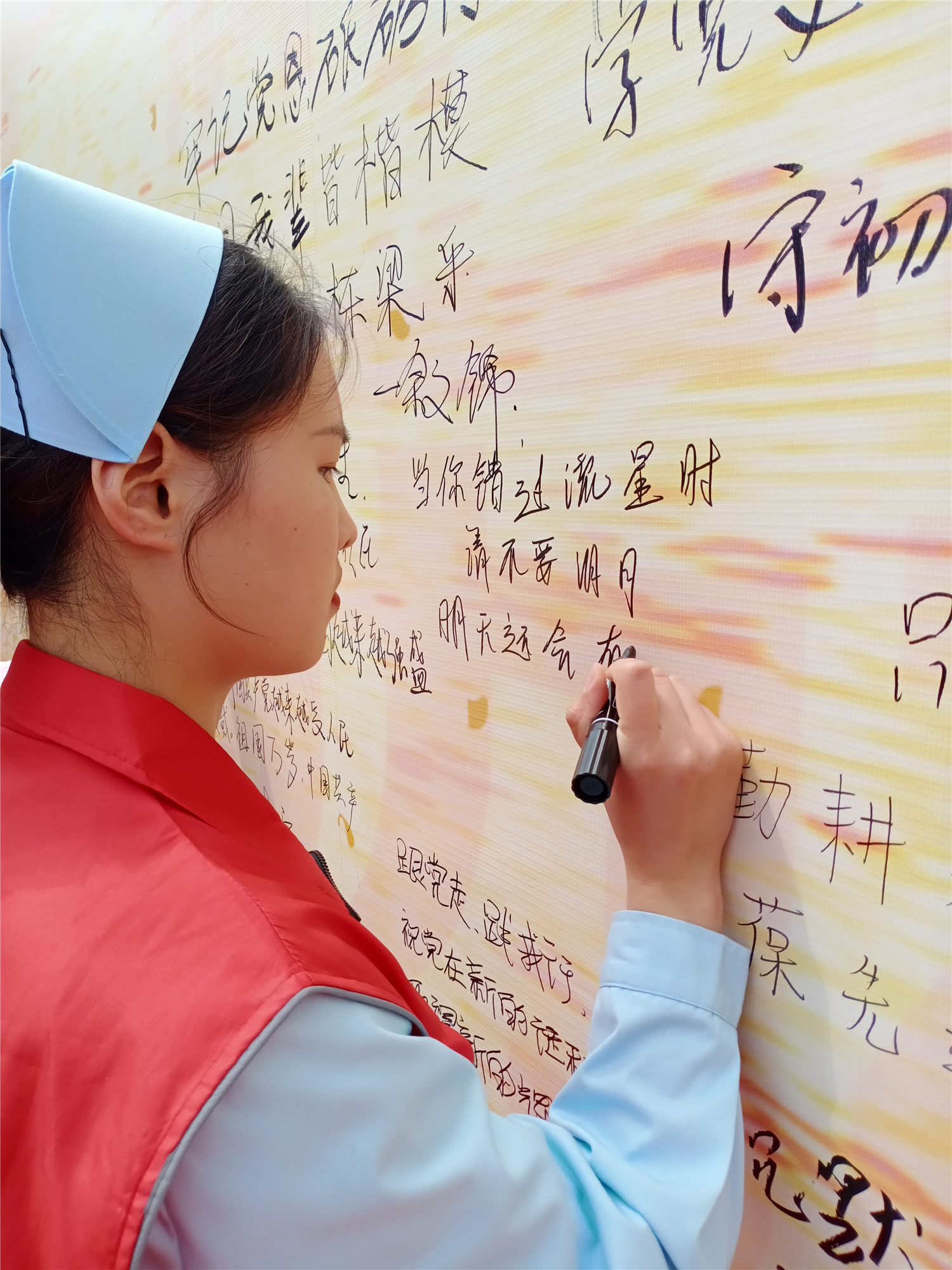 活动伊始,校党委副书记朱东方同志致辞表达对党百年奋斗的敬佩之情。随后同学们纷纷在寄语墙上写下自己的名字以及对党的深深祝福:“百年大党,风雨兼程,不忘初心谋复兴”;“为天地立心,为生民立命,为往圣继绝学,为万世开太平”;“牢记党恩砥砺行,今日我辈皆楷模,明日必为栋梁乎”……一句句深情的寄语流淌在签字笔尖,祝福党的百年复兴;一句句语句饱含了应院师生对党的深深热爱和恒久祝福。