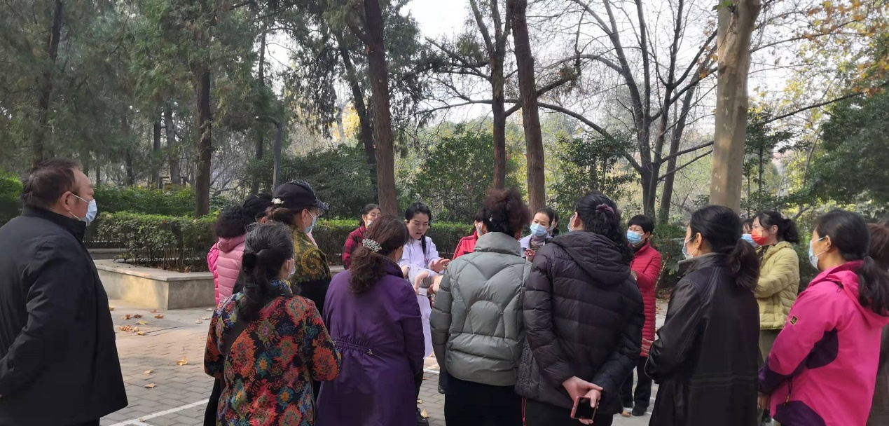 为了更好的普及家庭健康教育,让更多的人群掌握家庭急救与护理,2021年11月19日上午,九游体育官方网站护理学院基护教研室杨丽萍主任、刘丽老师、石豫洁老师来到郑州市碧沙岗公园,五一公园及人民公园,向广大人民群众进行家庭急救与护理知识的普及。