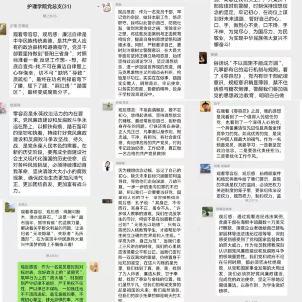 观看结束后,全体党员纷纷在护理学院党总支群内发表了观后感言。大家一致觉得必须坚定理想信念,筑牢思想防线,树立并保持正确的三观,坚决以一名共产党员的党性修养做好教育事业,以党的事业、集体的利益为重,经得起诱惑,保持足够的定力和操守,时刻警惕被腐蚀。