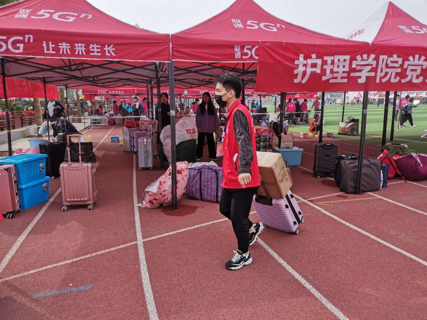 迎新前,护理学院设立了党员志愿服务站和行李寄存处。报到时,学生家长不允许进入学校,新生分别从东门、南门错时错峰报到入学。迎新期间,志愿者热情地引导新生到学院迎新点,主动帮助新生运送行李、办理报到手续,耐心地解答新生的困惑和问题。来来回回的接送工作也并没有使志愿者们懈怠于自己的工作,他们热心的欢迎每一位新生的到来,让刚踏入大学校园的新生们感受到了不一样的温暖。