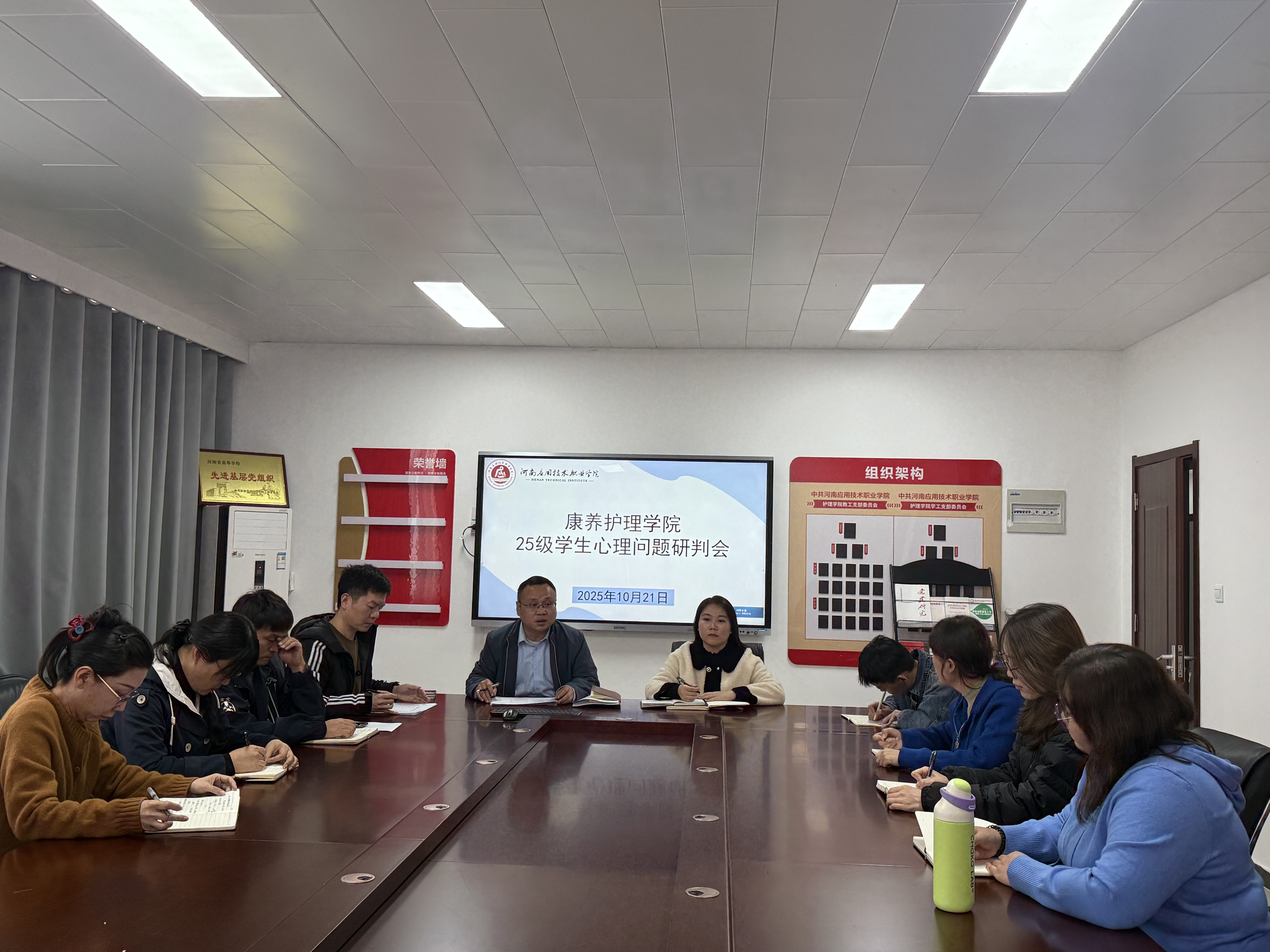 10月21日,学院组织召开了“25级学生心理问题研判会”。会上,心理专员梁海洋首先就我院25级学生的整体测评结果及约谈反馈情况进行了系统汇报。随后,各位辅导员结合本班实际,围绕重点关注学生的具体表现、潜在风险及初步干预措施进行了深入分析与交流。
