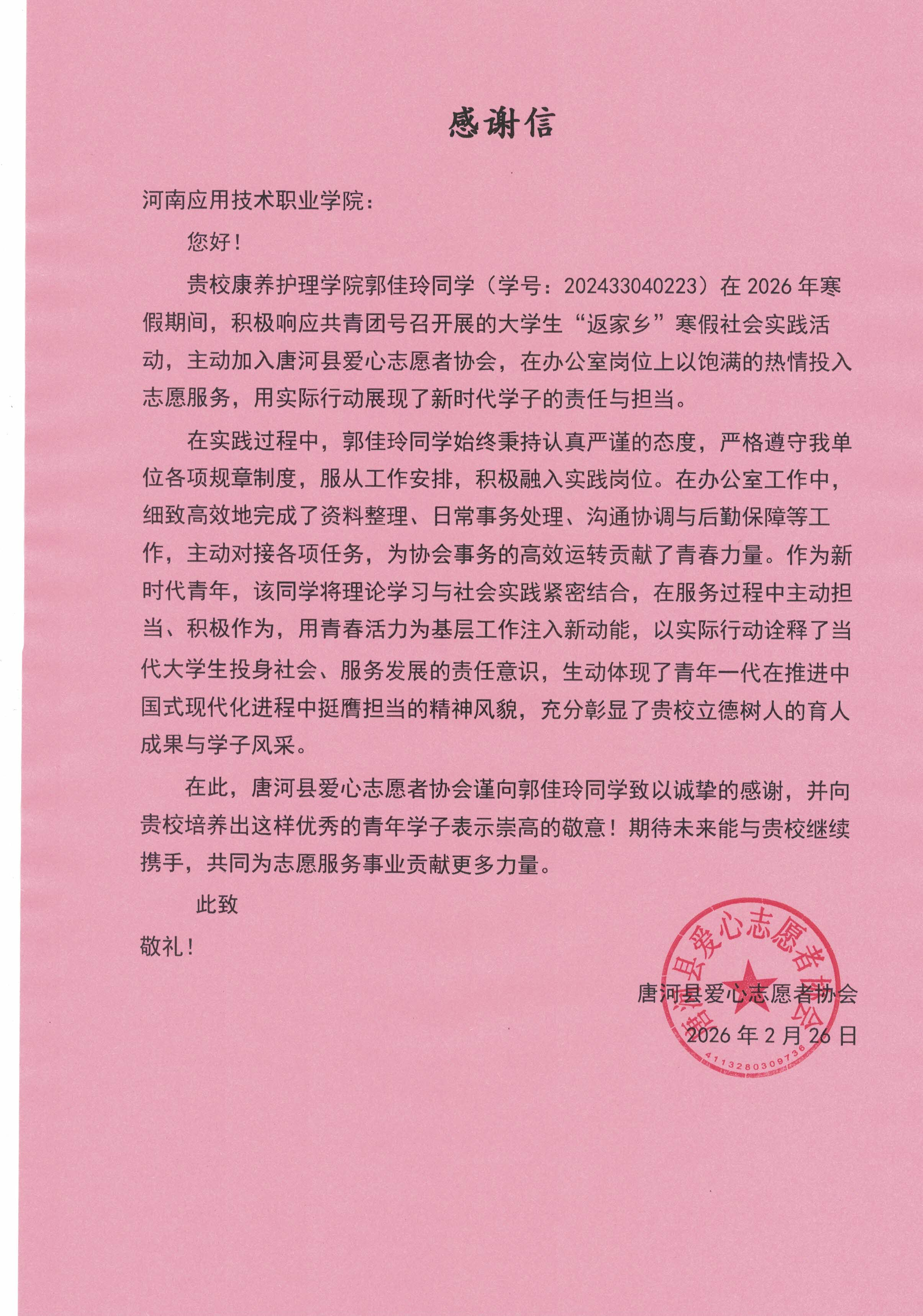 2026 年寒假,九游体育官方网站康复2402班郭佳玲同学积极响应共青团 “返家乡” 社会实践号召,前往唐河县新时代文明实践中心开展志愿服务,同时加入唐河县爱心志愿者协会参与多项工作。她以饱满的热情、扎实的行动扎根基层、服务家乡,生动诠释了新时代大学生的责任与担当,其出色的表现不仅收获了当地群众的认可,更被唐河县爱心志愿者协会专门致信感谢,彰显了九游体育官方网站的育人成效。