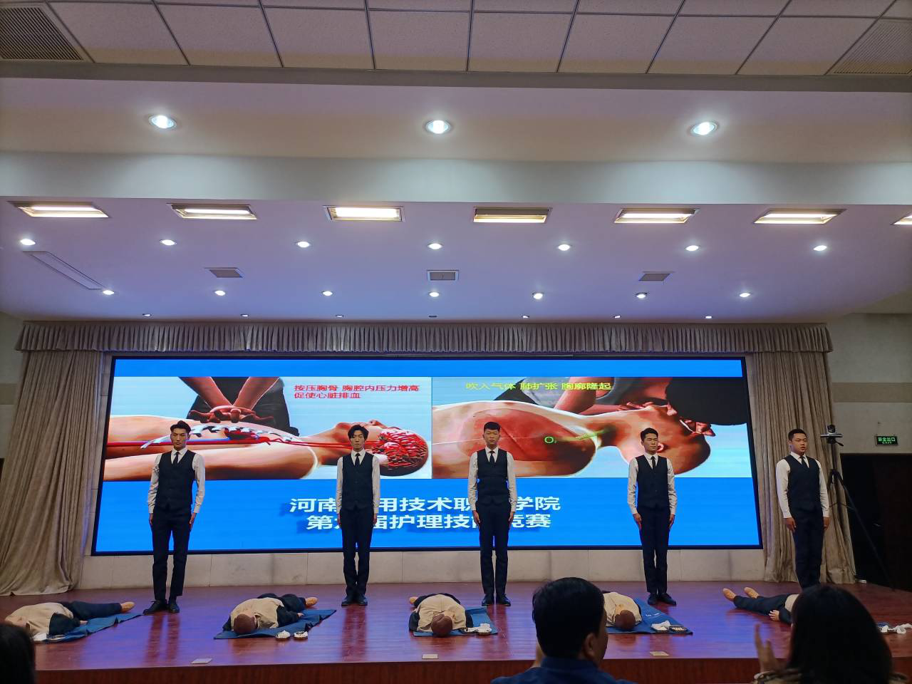 比赛开始,各位选手依次入场,从判断环境及病人意识、呼救和急救准备到完整的心肺复苏操作等各个环节做了一系列的展示,整个比赛现场充满了紧张的气氛,台下同学们掌声不断,为选手们的精彩表现喝彩!经过1个多小时激烈的比拼,评委老师们对每一位选手给出了客观公正的评分。
