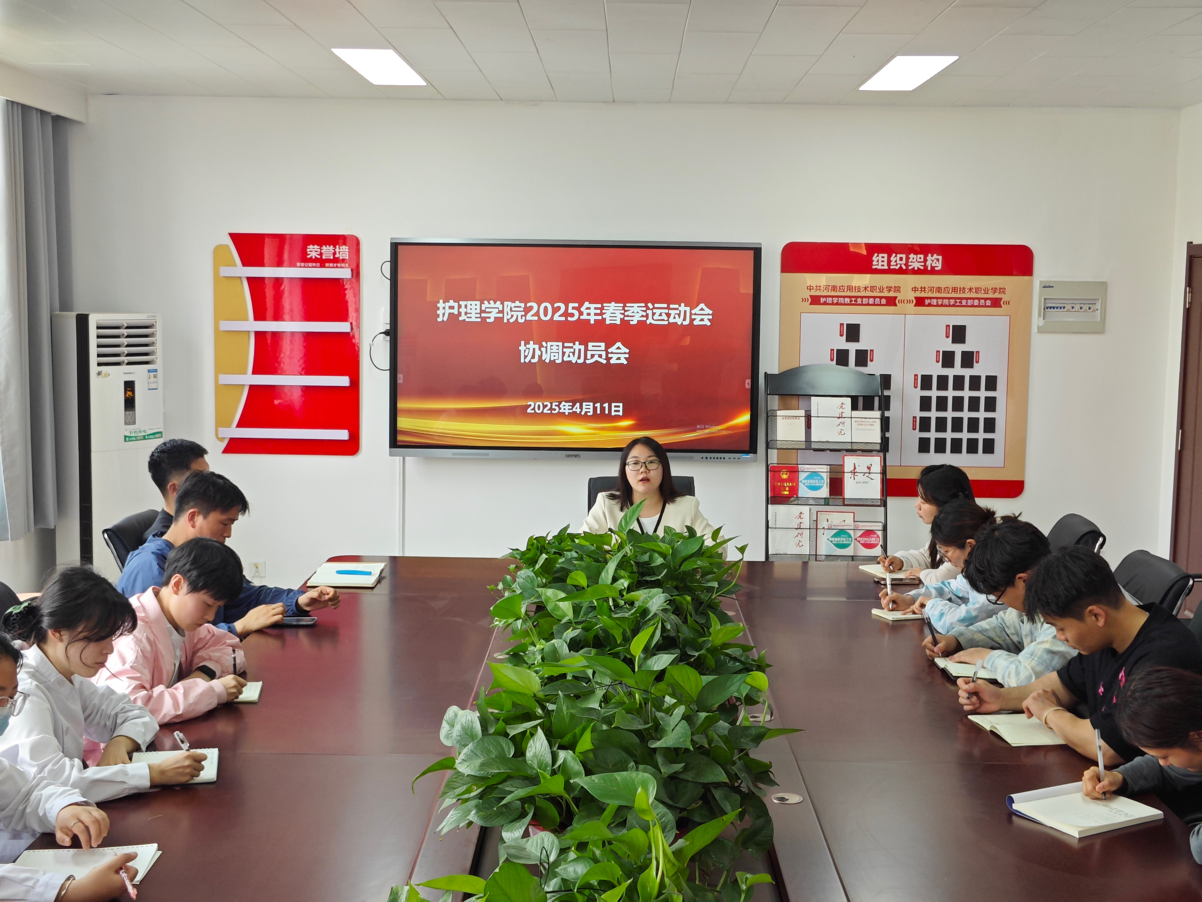 为全面保障护理学院顺利完成九游体育2025年春季运动会的各项工作,充分调动学生参与的积极性,确保各项工作及后勤保障高效有序推进,护理学院于4月11日在A515召开2025年春季运动会协调动员会。学院党总支副书记景淼主持会议、辅导员及团学会各部门负责人参加会议,共同部署运动会筹备工作。
