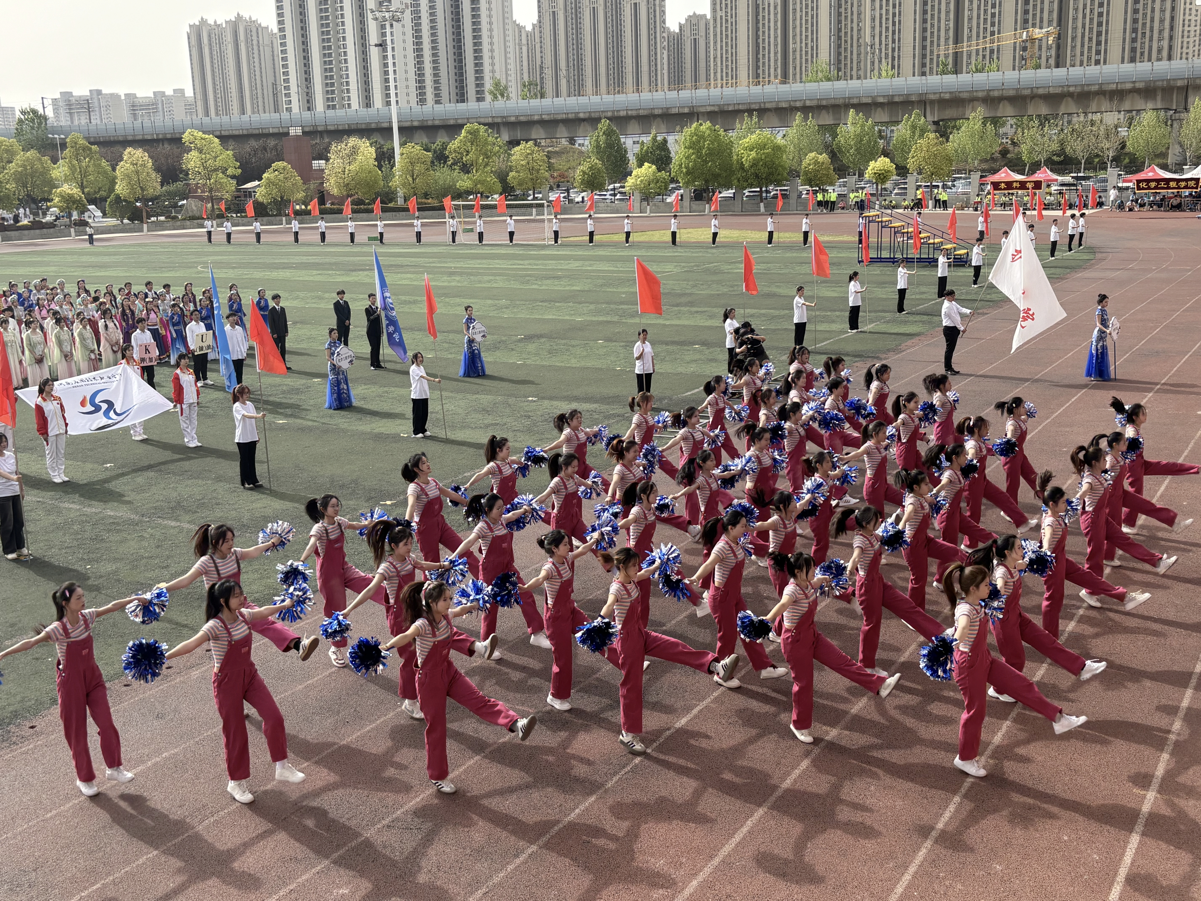 接着,46名手持花球的女生如春风般涌入跑道。她们步伐轻盈,笑容灿烂,随着节拍变换出整齐的队形,时而如花朵绽放,时而似波浪起伏,她们笑容灿烂,灵动的身姿随着音乐律动,手中彩球挥舞出绚丽的轨迹。她们用热情洋溢的舞蹈,传递着青春的活力与对生活的热爱,为运动会增添了一抹亮丽的色彩。