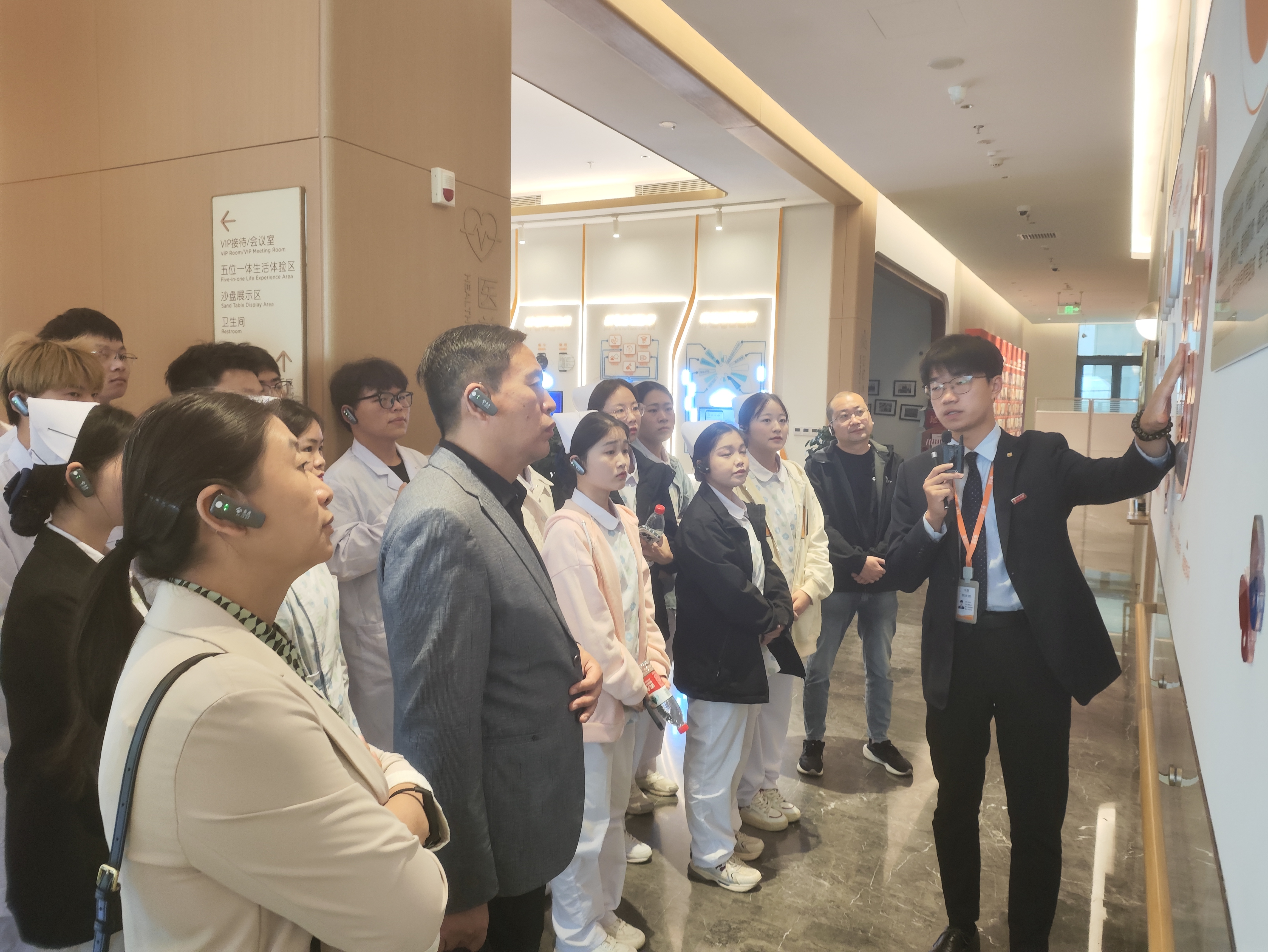 首先,在豫园工作人员的带领下参观了泰康之家超级体验馆,讲解员为大家介绍了五位一体生活展示区、服务体系、智慧医养、独立生活样板间、记忆小镇、共和国建设者之家、专业护理样板间等区域。