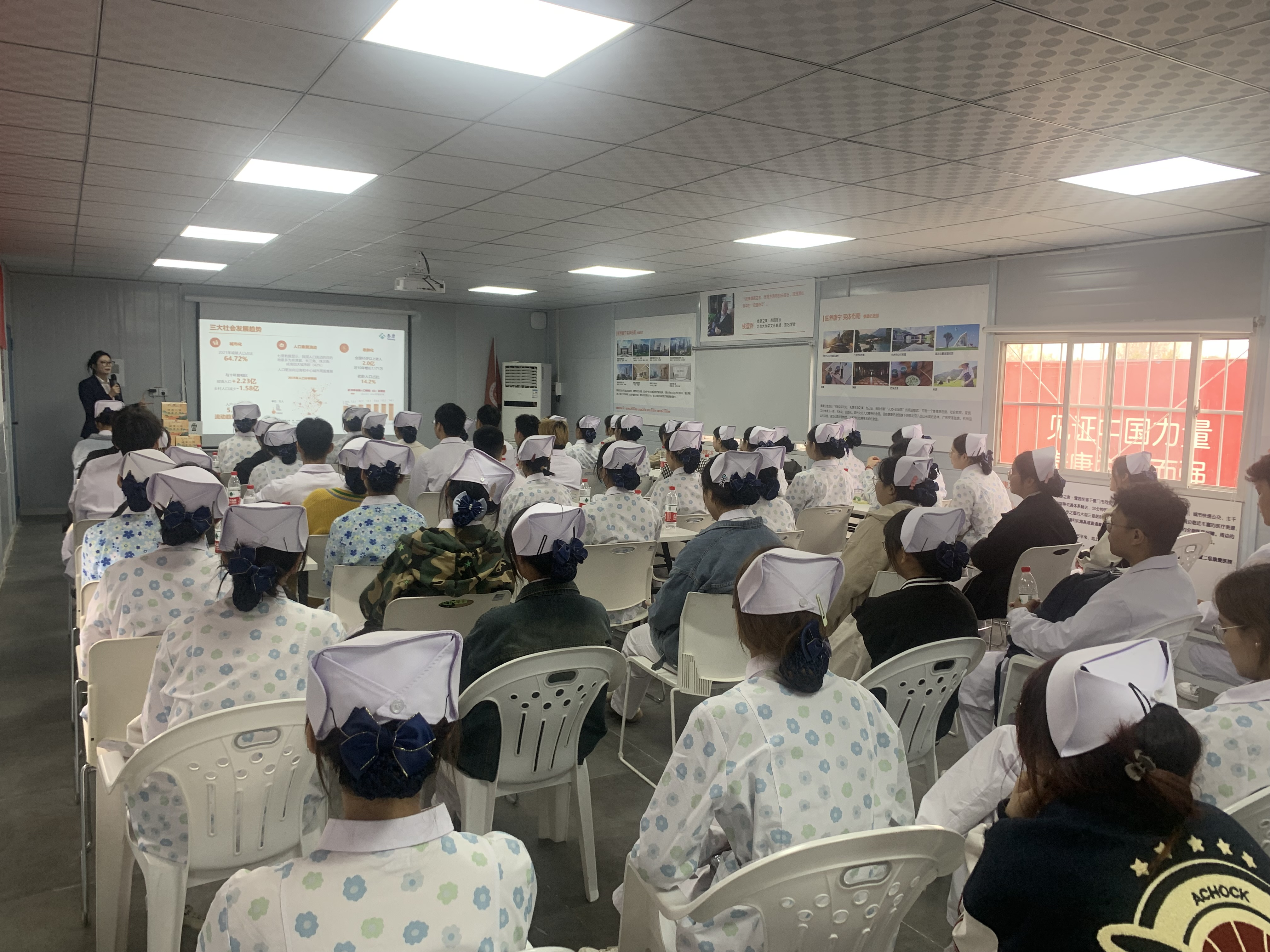 接着,师生兵分两路,一路由我院领导、教师与豫园双方围绕实习就业和校企合作方面进行了深入沟通和探讨,并达成合作意向,签订校企合作协议。另一路由豫园人力资源专员段佳音为即将实习的学生做“大健康产业与泰康之家介绍”的专题讲座,介绍了泰康之家的发展历程、实习要求及待遇。随后,我院师生一行参观了豫园的护理楼,亲身感受了养老院的工作流程和工作环境,同学们对实习工作充满期待。